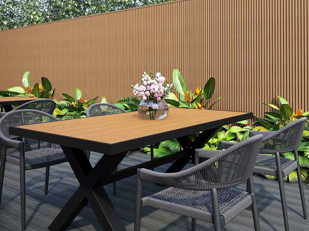 Perfect for a crowd, this set showcases an 86-inch BBQ table available in Icelandic Smoke White or Teak colors and features 8 outdoor rope chairs for mealtime and entertainment.